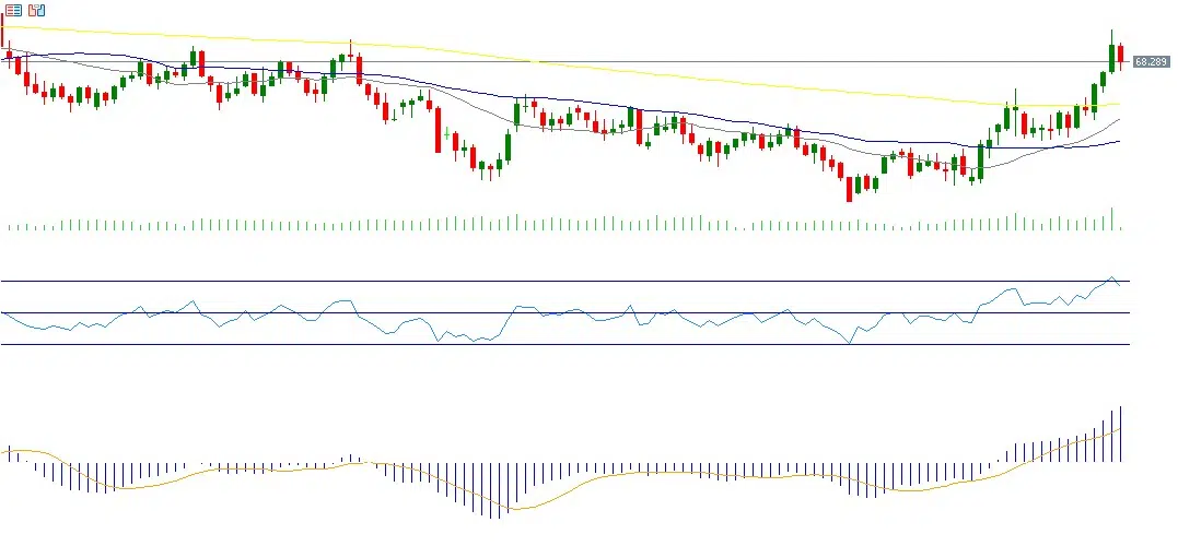 From a technical perspective, a bullish crossover, commonly referred to as a “golden cross,” has formed between the 20-day and 50-day moving averages, signaling a potential continuation of the upward trend in crude oil prices. In addition, prices have broken above the 200-day moving average. As for momentum indicators, the Relative Strength Index stands at 64, indicating positive momentum, while the MACD is trading above its signal line, suggesting that bullish momentum remains intact for this asset.