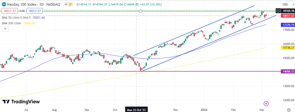The Nasdaq 100 index reached a record level of 18,333 points on Friday, March 1, 2024, marking its highest peak to date, and closed yesterday at 18,017 points. Since the beginning of the year, it has risen by 8%, and from its low point on October 26, 2023, at 14,058 points, it has surged by approximately 30%, firmly establishing the Nasdaq 100 index in a bull market.
