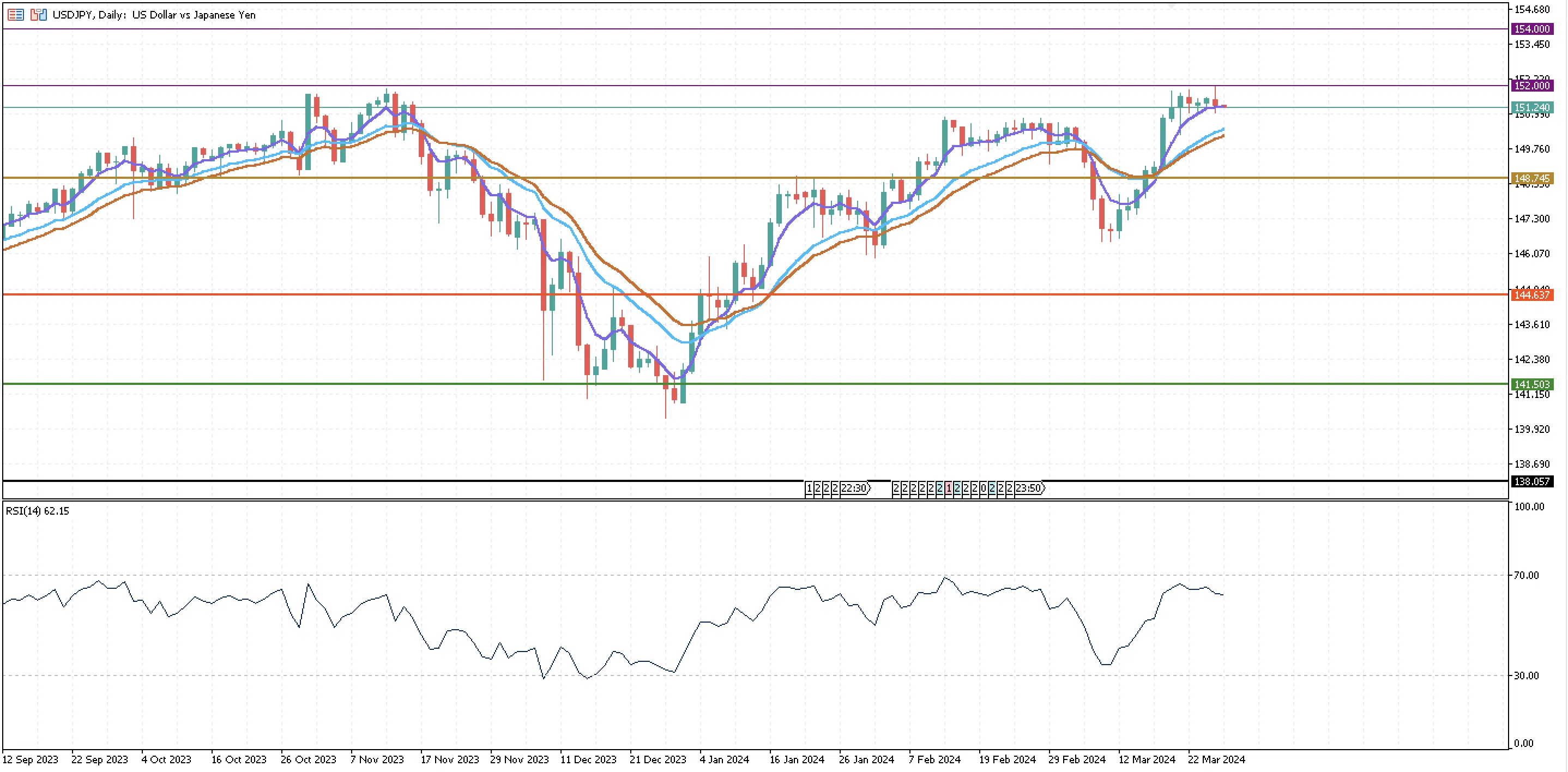 So far, the price of the Yen has yet to reach $152, which is its closest and most significant resistance. The USDJPY traded at $151.96 on Wednesday and is up 7% during the first quarter of 2024. There are three exponential moving averages that are currently supporting the price, 5, 15, and 20-day, and there was a golden cross on March 19 that signalled a bullish trend on the USDJPY that helped the price reach higher highs around $152. At the top, the $154 level is the upper boundary of the range the BoJ is considering to intervene in the market and bring the pair down. Beyond the three exponential moving averages is a monthly support at $148.74.