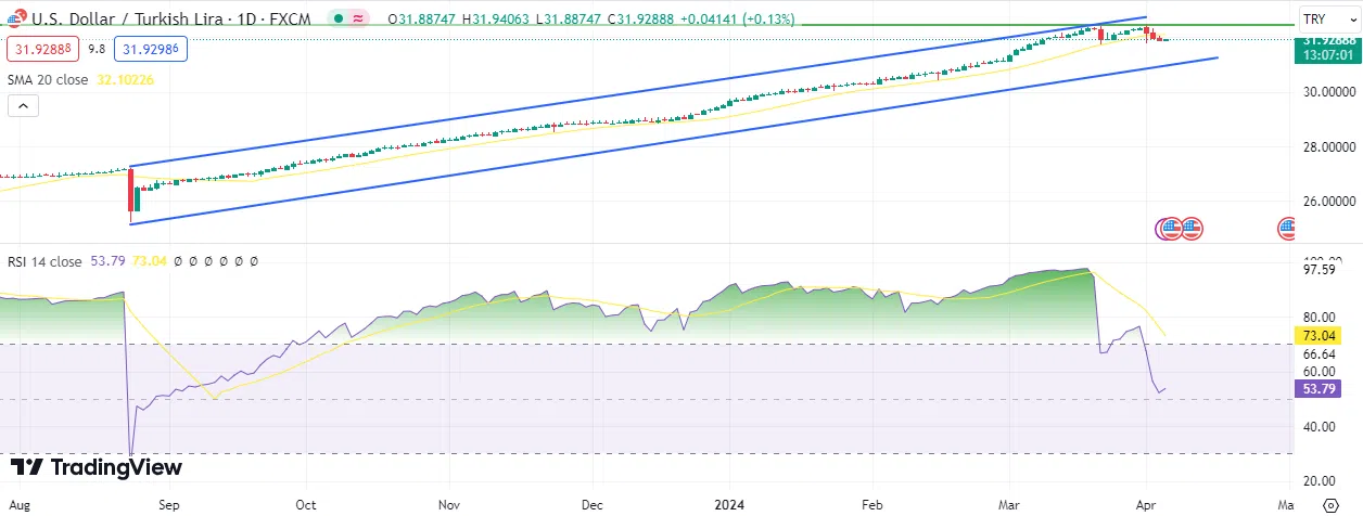 Regarding the Relative Strength Index (RSI), currently at 54 points, it suggests a moderately positive momentum for the dollar pair against the Turkish lira.