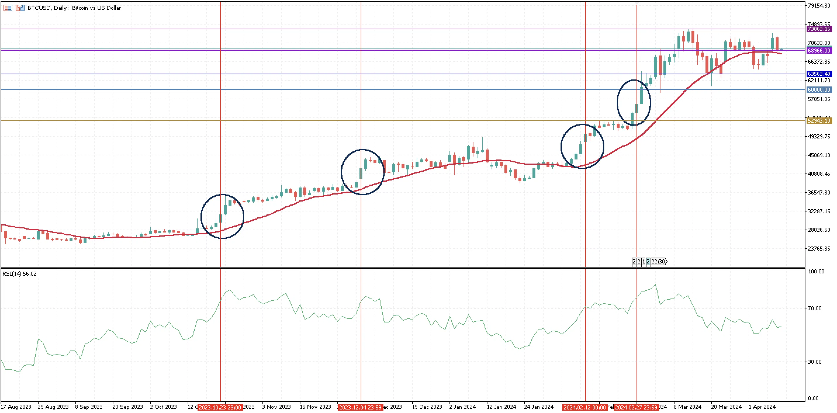 Bitcoin price has been consolidating around $68,966 and keeps trading above its 20-day moving average. There is a second support at around $63,562.4. On the other hand, the next significant resistance for the price is the all-time high of $73,862.16, which could limit a future Bitcoin rally if the halving indeed pushes the price up.