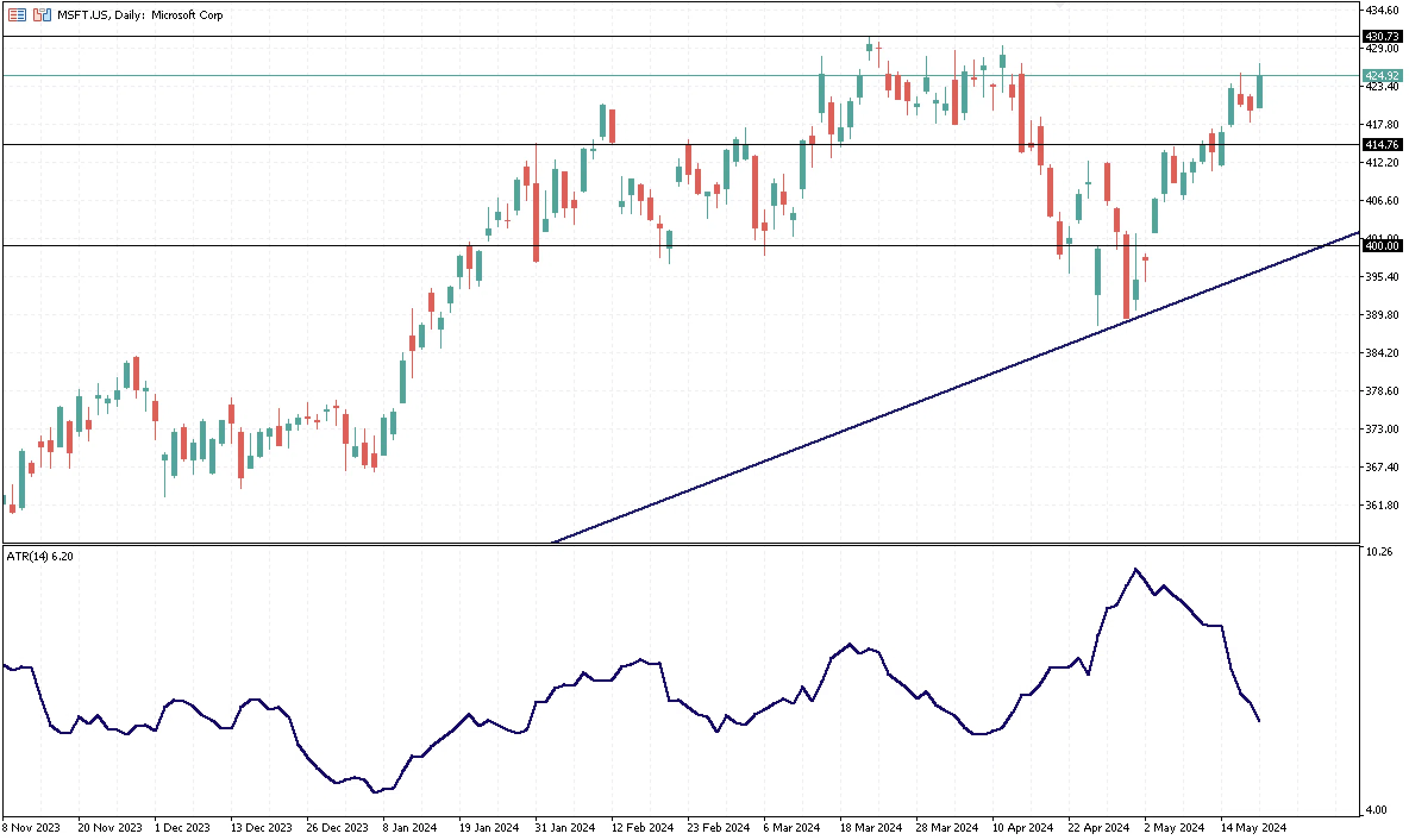 Microsoft’s stock has been bullish during May and has significantly recovered from April’s bearish trend. Volatility has been decreasing, as shown by the ATR indicator, and the stock price is getting closer to an all-time high of 430.73. As investors get more confidence in Microsoft’s new bet on AI, the stock could eventually reach higher highs. On the other hand, as support, the closest level is 414.76, which is a significant weekly floor for the price.