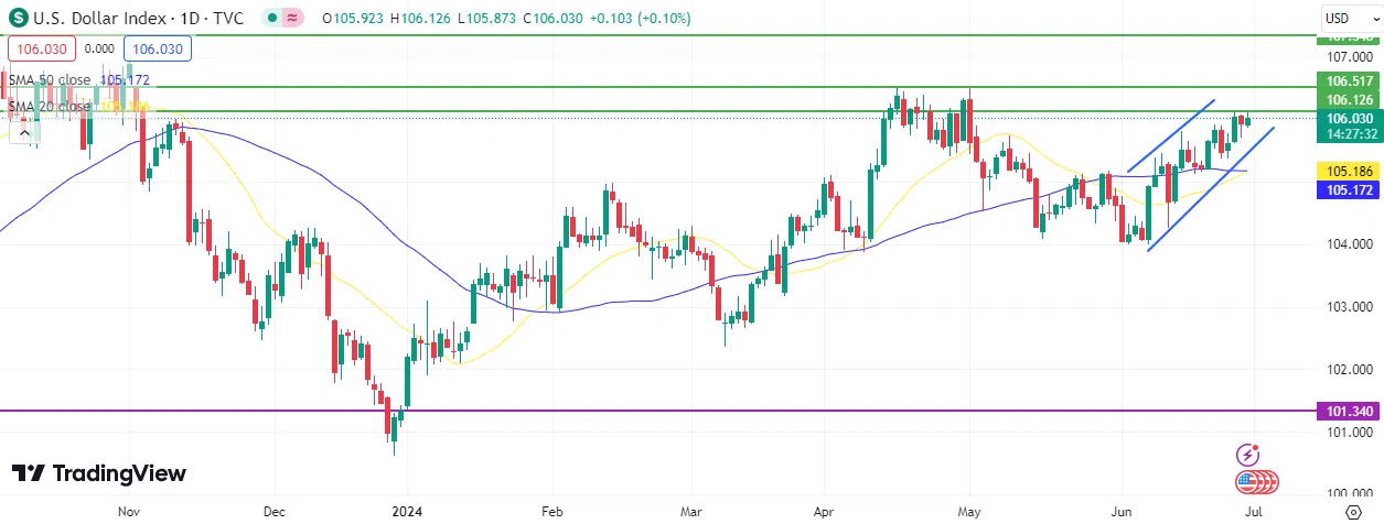 The US Dollar Index, which measures the dollar’s performance against a basket of six major currencies, rose to 106.13 points today, its highest level since May 1, 2024. It is currently hovering around the 106 level. It appears that the level of 106.13 points is a stubborn resistance level, and any breach upwards of this point could reach 106.51 points, which is the level recorded on April 16, 2024.