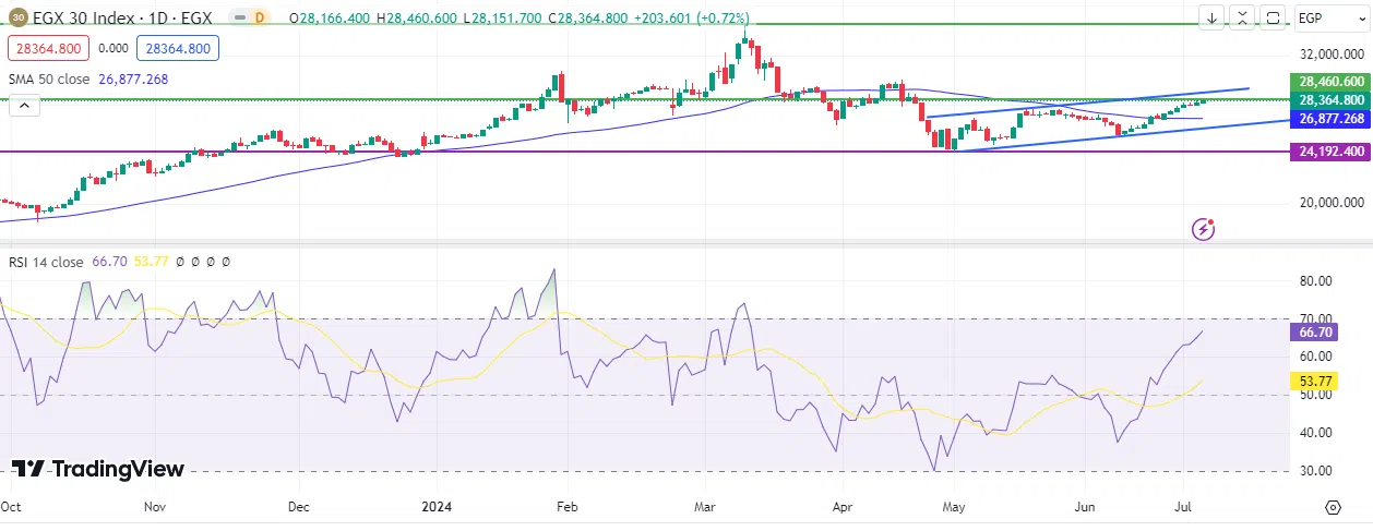 Second: The Relative Strength Index (RSI) records 67 points, which indicates positive momentum for the EGX30 index.