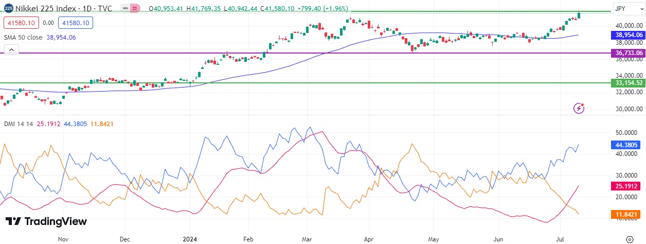 Directional Movement Index (DMI): The positive movement index (DMI+) is approximately 44 points, compared to the negative movement index (DMI-), which is around 12 points. The significant gap between these two indicators suggests strong buying pressure on the Nikkei 225. Moreover, the ADX trend strength indicator is green, recording about 25 points, indicating strong momentum in this upward trend.