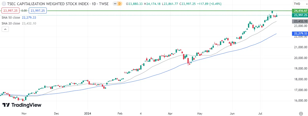 On Thursday, July 11, 2024, Taiwan’s TAIEX index surged to 24,416 points, marking its highest level ever. Today, it closed slightly lower at 23,997 points, reflecting a notable increase of approximately 34% since the beginning of the year. This growth outpaced major global indices including those of the US, Europe, China, Japan, and India.