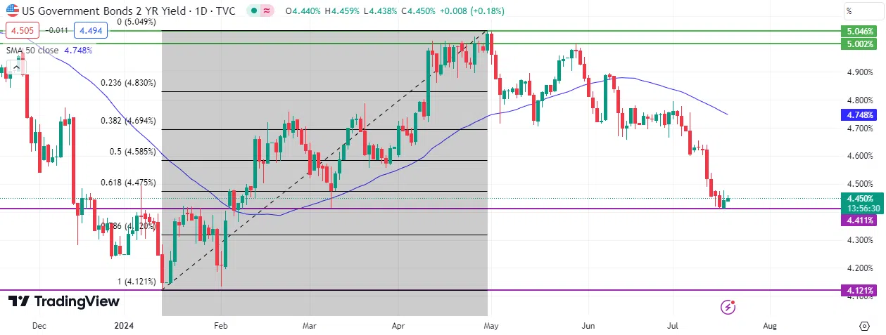 According to Fibonacci retracement levels, the two-year bond yield is likely to fall to 4.320% (78.60% level) and 4.121% (100.00% level).