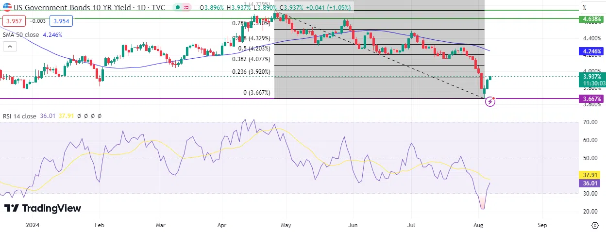 From a technical perspective, the momentum for the 10-year bond yield appears negative, as indicated by the Relative Strength Index, which is currently around 36 points. According to Fibonacci retracement levels, the 10-year bond yield is likely to rise to 4.077% (38.20%), 4.203% (50.00%), and 4.329% (61.80%).