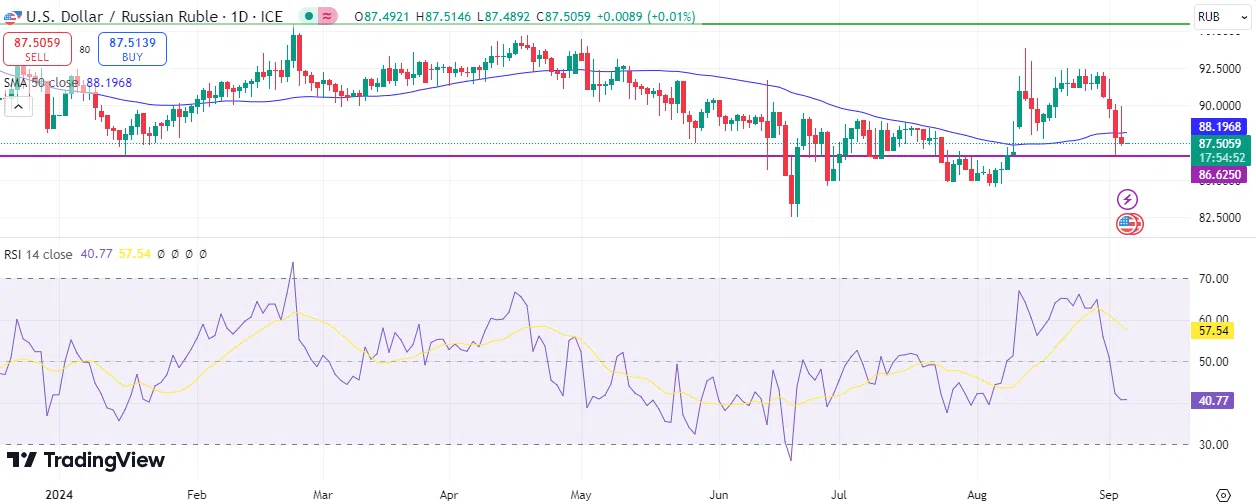From a technical perspective, if the pivot point at 88.39 for the USD/RUB pair is broken, it could target support levels at 86.49, 85.19, and 83.29. Conversely, if the pivot point is surpassed, it may target resistance levels at 89.69, 91.59, and 92.89. The Relative Strength Index (RSI), currently at 40 points, indicates negative momentum for the USD/RUB pair.