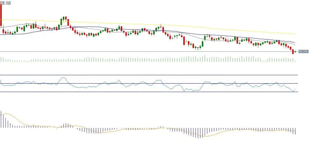 أما مؤشر القوة النسبية، فيسجل حاليًا 37 نقطة، ما يشير إلى استمرار الزخم السلبي لأسعار النفط. كما يظهر مؤشر MACD تقاطعًا هبوطيًا بين خط الماكد وخط الإشارة، مما يعزز احتمالات استمرار الضغوط البيعية على أسعار النفط الخام.