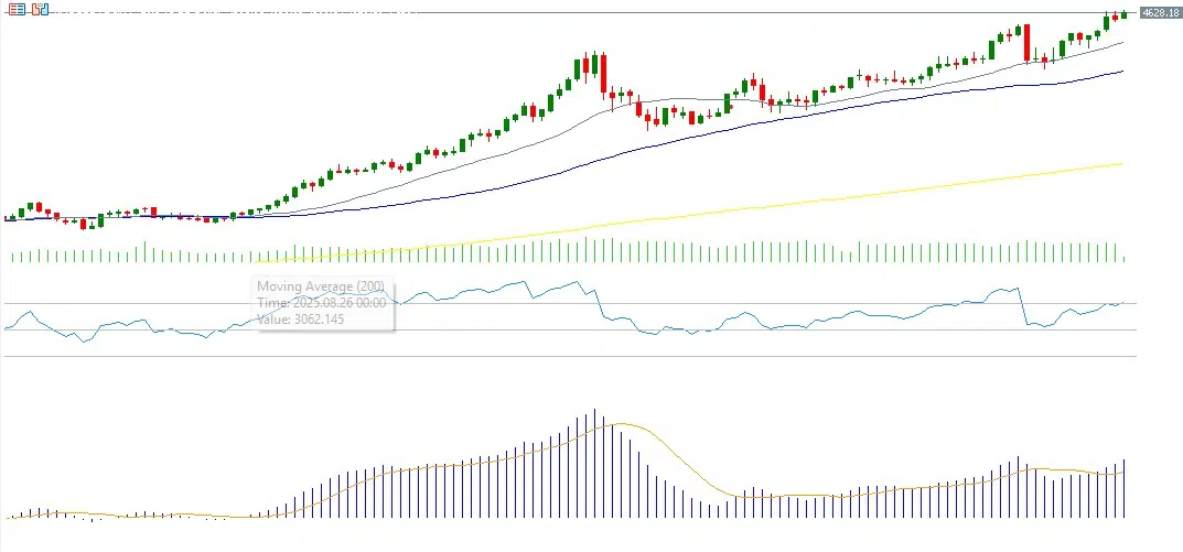 - هناك انتظام واضح في المتوسطات المتحركة لـ20 و50 و200 يوم واتجاهها الصعودي، حيث يتجاوز متوسط 20 يومًا متوسط 50 يومًا، ويتجاوز متوسط 50 يومًا متوسط 200 يوم.