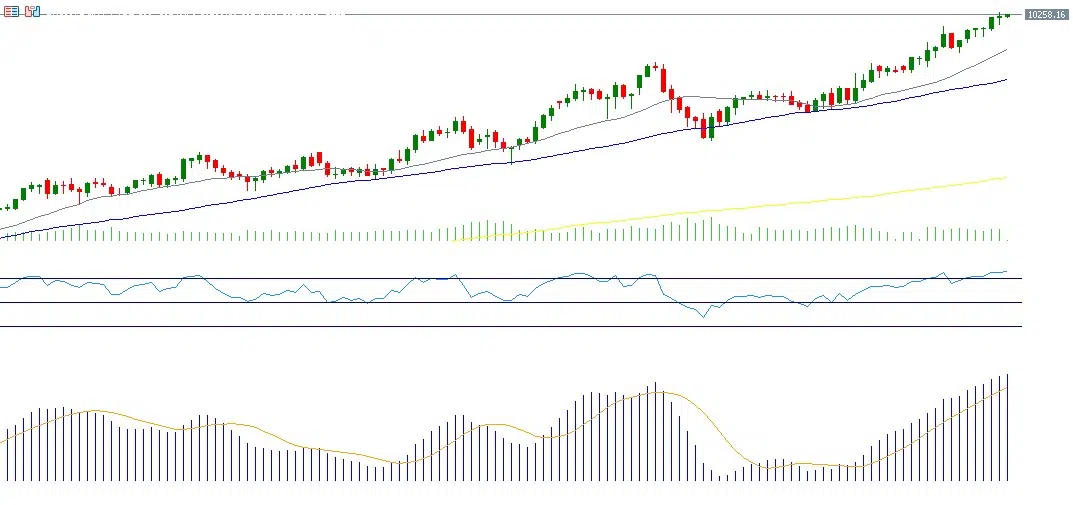 كما يسجّل مؤشر القوة النسبية حاليًا نحو 75 نقطة، أي ضمن منطقة التشبع الشرائي، ما يشير إلى وجود زخم إيجابي قوي للمؤشر. ويُظهر مؤشر MACD تقاطعًا صعوديًا بين خط الماكد وخط الإشارة، الأمر الذي يدعم استمرار الزخم الإيجابي لمؤشر فوتسي 100.