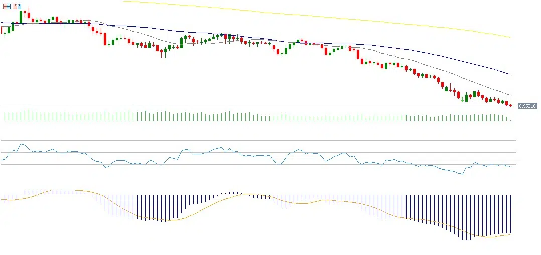 ومن الناحية الفنية، تشير المؤشرات إلى احتمال استمرار تراجع زوج الدولار الأميركي مقابل اليوان الصيني خلال الفترة المقبلة، وذلك لعدة أسباب. أولًا، لا يزال هناك تقاطع هبوطي بين المتوسط المتحرك لـ20 يومًا والمتوسط المتحرك لـ50 يومًا، ما يشير إلى استمرار الزخم السلبي. ثانيًا، يسجل مؤشر القوة النسبية حاليًا نحو 26 نقطة، أي ضمن منطقة الإفراط البيعي، ما يعكس استمرار الزخم السلبي للزوج. ثالثًا، يُظهر مؤشر MACD تقاطعًا هبوطيًا بين خط الماكد وخط الإشارة، مما يدعم احتمالات استمرار الزخم السلبي خلال الفترة المقبلة.