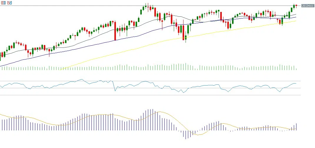 • سجل 26,165 نقطة يوم أمس، وأغلق عند 26,023 نقطة.