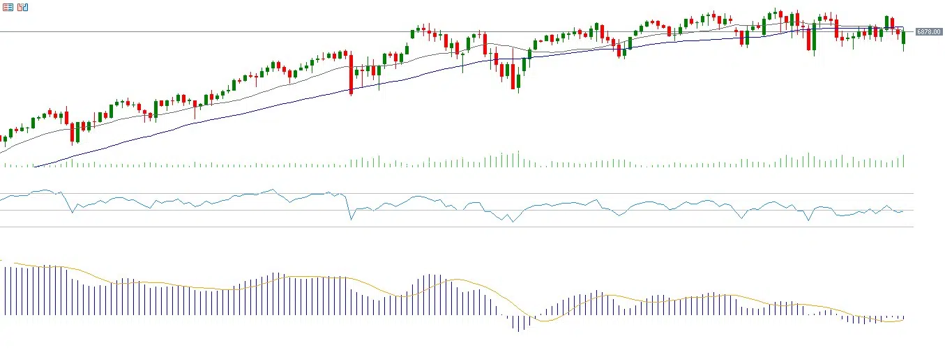 ومن الناحية الفنية لمؤشر S&P 500، شهدنا تقاطعًا هبوطيًا بين المتوسط المتحرك لـ20 يومًا والمتوسط المتحرك لـ50 يومًا، ما قد يشير إلى بداية اتجاه هبوطي للمؤشر. كما يسجل مؤشر القوة النسبية مستوى 48 نقطة، ما يدل على زخم يميل إلى السلبية، إلى جانب ظهور تقاطع هبوطي بين خط الماكد وخط الإشارة، وهو ما يعزز احتمالات استمرار الزخم السلبي للمؤشر.