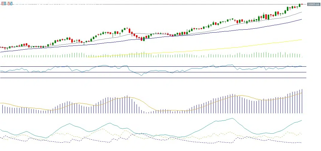 كما يسجّل مؤشر القوة النسبية حاليًا نحو 74 نقطة، أي ضمن منطقة التشبع الشرائي، ما يشير إلى وجود زخم إيجابي قوي للمؤشر. ويُظهر مؤشر MACD تقاطعًا صعوديًا بين خط الماكد وخط الإشارة، الأمر الذي يدعم استمرار الزخم الإيجابي لمؤشر فوتسي 100.