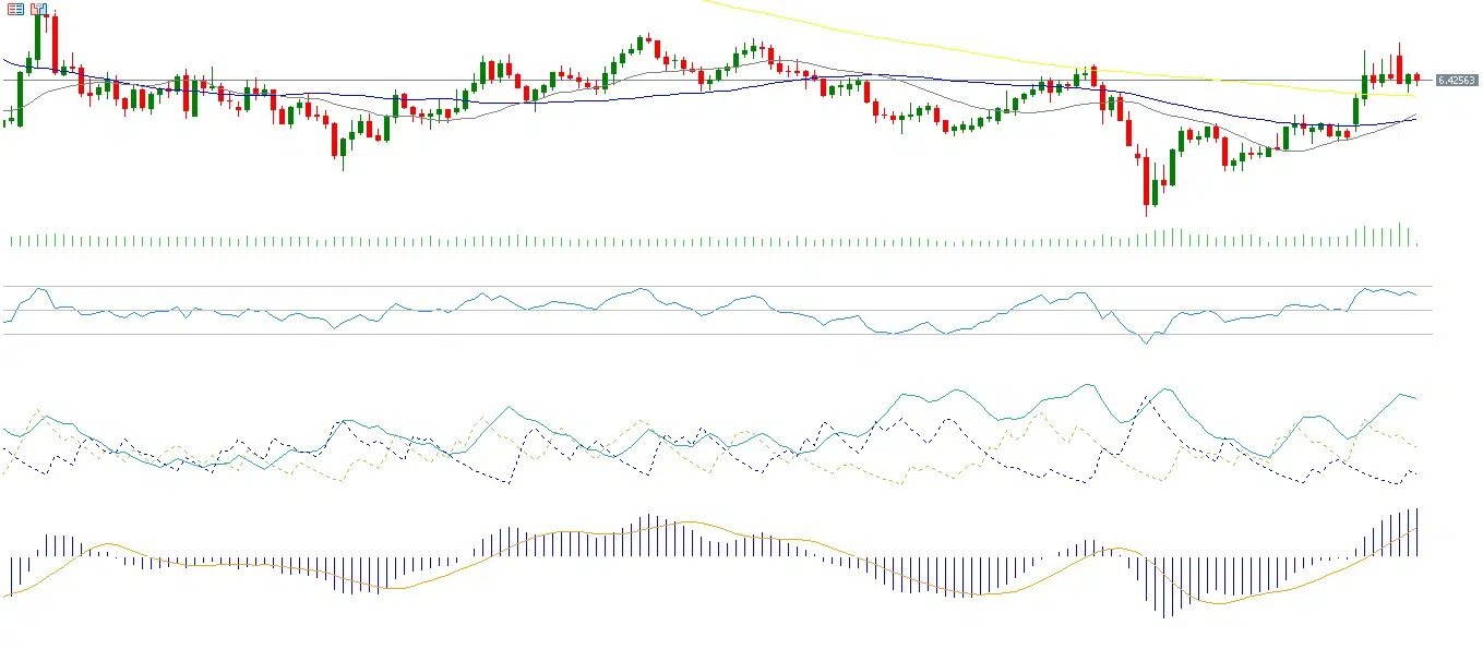 إذا تم كسر نقطة الارتكاز عند 6.4256، فقد يستهدف الزوج مستويات الدعم التالية: 6.4135، 6.3916، و6.3795. أما في حال تجاوز نقطة الارتكاز صعودًا، فقد يستهدف مستويات المقاومة عند: 6.4256، 6.4596، و6.4815.