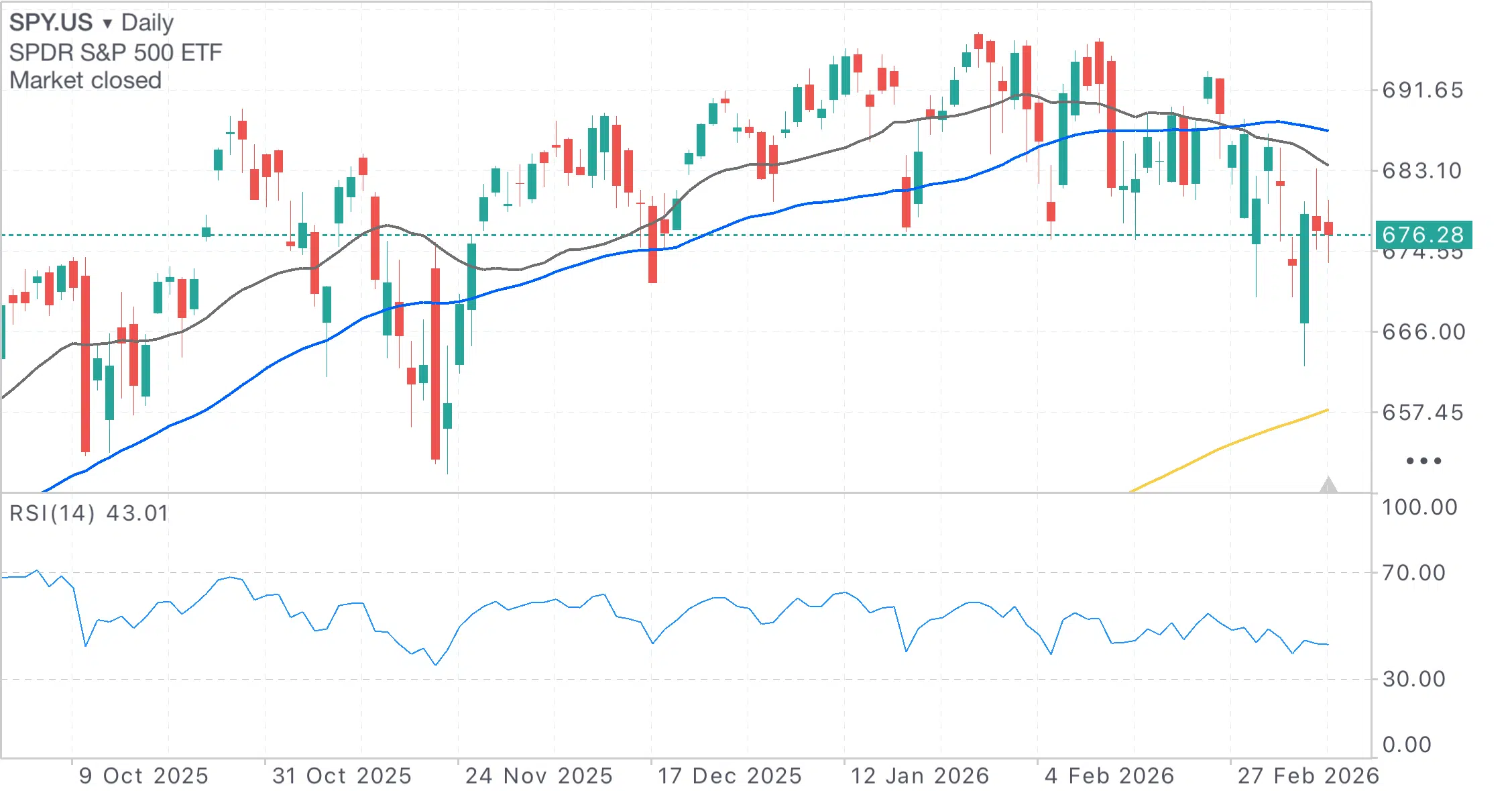 ومن الناحية الفنية، تبدو المؤشرات داعمة لاستمرار الاتجاه الهابط لصندوق المؤشرات المتداولة SPDR المتتبع لمؤشر إس آند بي 500 (SPY) خلال المرحلة المقبلة، إذ شهد الصندوق تقاطعًا هبوطيًا بين المتوسط المتحرك لـ20 يومًا والمتوسط المتحرك لـ50 يومًا، ما يُعد إشارة فنية سلبية لاحتمال مواصلة الهبوط. كما يسجل مؤشر القوة النسبية حاليًا مستوى يقارب 44 نقطة، وهو ما يعكس زخمًا سلبيًا للصندوق. إلى جانب ذلك، يظهر تقاطع هبوطي بين خط الماكد وخط الإشارة، وهو ما يعزز احتمالات استمرار الزخم السلبي للمؤشر.