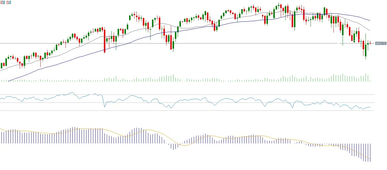 ومن الناحية الفنية لمؤشر S&P 500، شهدنا تقاطعًا هبوطيًا بين المتوسط المتحرك لـ20 يومًا والمتوسط المتحرك لـ50 يومًا، ما قد يشير إلى بداية اتجاه هبوطي للمؤشر. كما يسجل مؤشر القوة النسبية مستوى 36 نقطة، ما يدل على الزخم السلبي، إلى جانب ظهور تقاطع هبوطي بين خط الماكد وخط الإشارة، وهو ما يعزز احتمالات استمرار هذا الزخم السلبي.