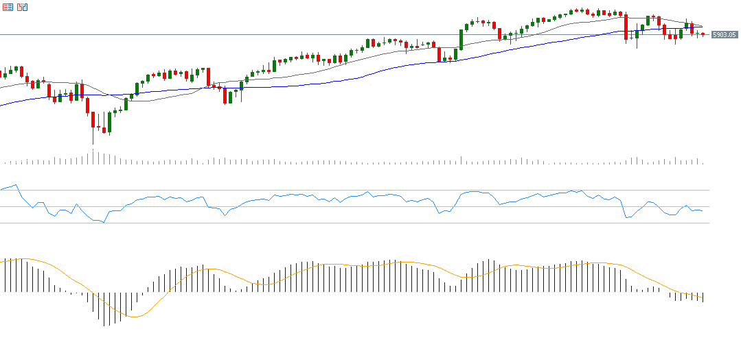 التحليل الفني لمؤشر S&P 500: من الناحية الفنية، يتداول مؤشر S&P 500 دون متوسط المتحرك لـ 20 يومًا باللون الرمادي عند 5,972 نقطة، ودون أيضًا متوسط المتحرك لـ 50 يومًا باللون الأزرق عند 5,952 نقطة. ويبقى حاجز متوسط الـ 200 يوم عند 5,570 نقطة مستوى دعم استراتيجي. وأي اختراق هبوطي لهذا الدعم قد يؤدي إلى استمرار الاتجاه الهابط للمؤشر S&P 500. أما مؤشر القوة النسبية RSI فيسجل حاليًا 46 نقطة، ما يشير إلى الزخم الهبوطي للمؤشر. أما مؤشر MACD، فيظهر تقاطع نزولي بين مؤشر MACD باللون الأزرق مع الـ SIGNAL LINE باللون البرتقالي، مما يعطي زخمًا سلبيًا لمؤشر S&P 500.