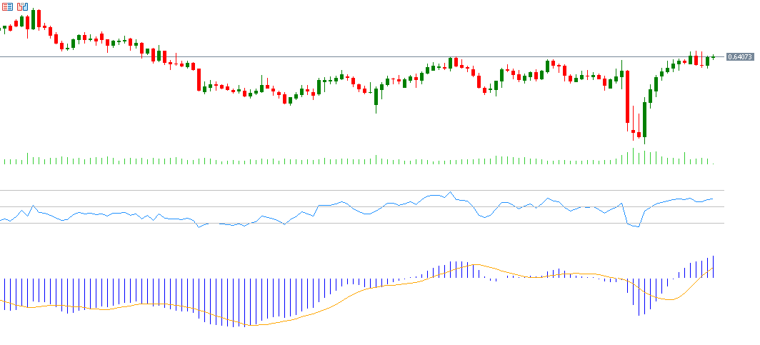 ويسجل مؤشر القوة النسبية (RSI) حاليًا 59 نقطة، مما يشير إلى وجود زخم إيجابي لزوج الدولار الأسترالي مقابل الدولار الأميركي. كما يظهر مؤشر MACD باللون الأزرق متجاوزًا خط الإشارة (Signal Line) باللون البرتقالي، مما يعزز الزخم الإيجابي أيضًا.