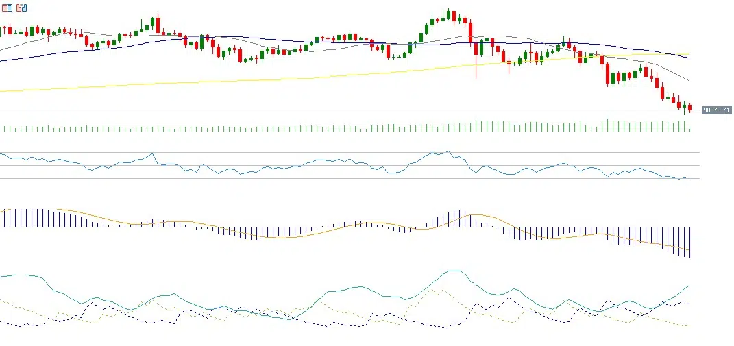 - يسجل مؤشر الحركة الإيجابية (DMI+) نحو 8 نقاط، مقابل 35 نقطة لمؤشر الحركة السلبية (DMI-). ونلاحظ اتساع الفجوة بينهما، مما يشير إلى ضغوط بيعية قوية على البيتكوين. كما يسجل مؤشر قوة الاتجاه (ADX) حوالي 36 نقطة، ما يدل على قوة الاتجاه الهابط.