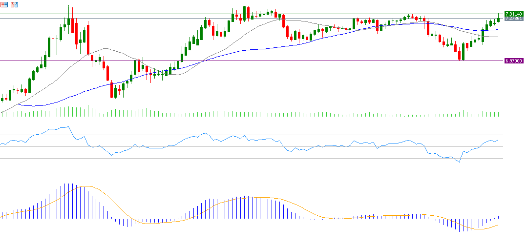 سجل سعر الدولار الأميركي مقابل اليوان الصيني 7.3142 يوم الثلاثاء في 3 ديسمبر 2024، وهو أعلى مستوى له منذ 3 نوفمبر 2023، ويتداول هذا الزوج حاليًا قرب مستويات 7.2800. وارتفع سعر زوج الدولار الأميركي مقابل اليوان الصيني بنحو 5% منذ قاع 27 سبتمبر 2024، حيث سجل 6.9691، إلى القمة التي سجلها يوم الثلاثاء في 3 ديسمبر 2024 والتي بلغت 7.3142. وارتفع بنحو 2% منذ مطلع العام حتى اليوم. أما بالنسبة لمؤشر القوة النسبية، فهو يسجل حاليًا حوالي 62 نقطة، ما يشير إلى الزخم الإيجابي لزوج الدولار الأميركي مقابل اليوان الصيني.