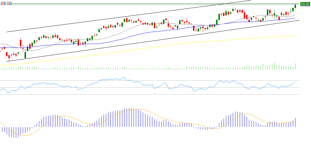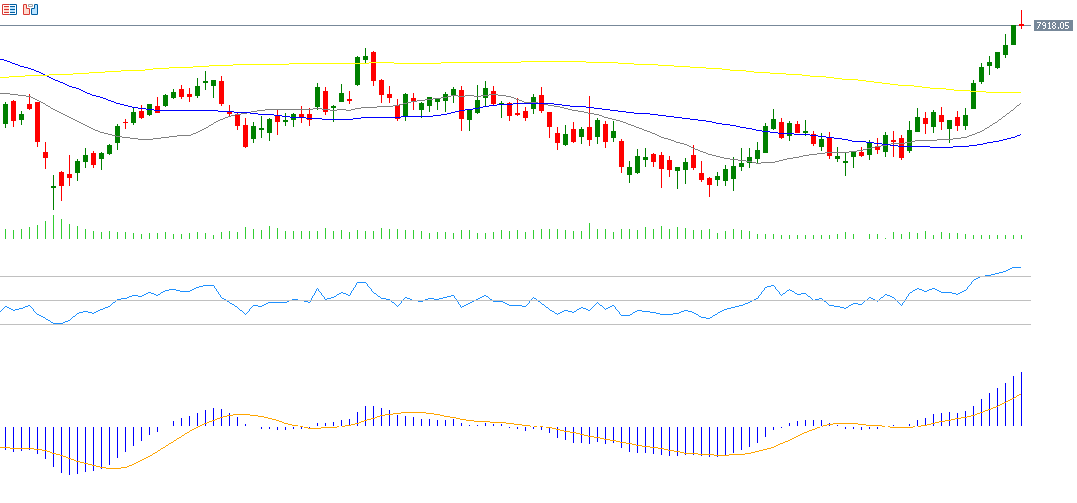 يتوقع استمرار الزخم الإيجابي للمؤشر، خاصةً مع احتمالات تخفيض أسعار الفائدة الأوروبية في المستقبل. يسجل مؤشر القوة النسبية (RSI) حاليًا 77 نقطة، ما يشير إلى التشبع الشرائي وزخم صعودي.