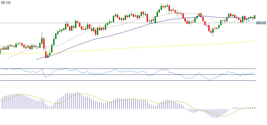 تراجع زوج الجنيه الإسترليني مقابل الدولار الأميركي للأسبوع الثالث على التوالي، مسجّلًا مستوى 1.3363 يوم الخميس 15 يناير 2026، وهو أدنى مستوى له منذ 22 ديسمبر 2025، ليغلق عند 1.3376، متراجعًا بنحو 1% منذ بداية العام وحتى اليوم. ويسجّل مؤشر القوة النسبية (RSI) حاليًا نحو 46 نقطة، ما يشير إلى زخم سلبي للزوج. كما يظهر تقاطع هبوطي بين خط مؤشر MACD (باللون الأزرق) وخط الإشارة (Signal Line) (باللون البرتقالي)، مما يعزّز احتمالات استمرار الزخم السلبي.