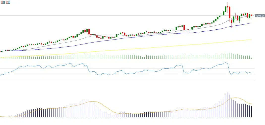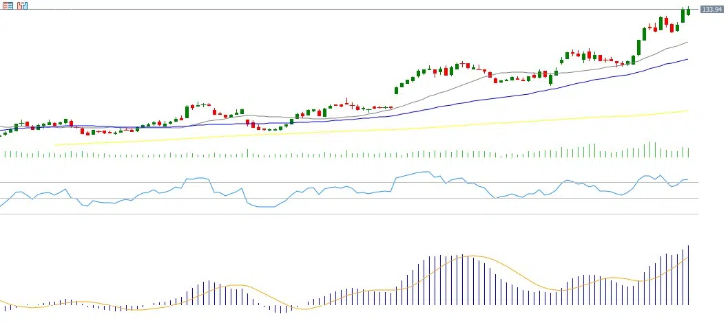 أما فنيًا، فيسجّل مؤشر القوة النسبية (RSI) حاليًا 52 نقطة، ما يشير إلى زخم صعودي معتدل للمؤشر. كما يظهر مؤشر MACD تقاطعًا صعوديًا بين خط MACD (باللون الأزرق) وخط الإشارة (Signal Line) (باللون البرتقالي)، ما يعزّز النظرة الإيجابية للمؤشر.