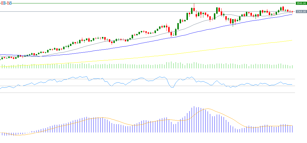 تراجعت أسعار الذهب بنحو 1.86% الأسبوع الماضي، وتتداول بشكل عرضي أفقي منذ شهرين حتى اليوم بين مستويات 3,200 و3,400 دولار. مع توقعات بارتفاع أسعار الذهب في المرحلة القادمة، خاصة في ظل استمرار ضعف الدولار الأميركي وتصاعد التوترات الجيوسياسية، وضبابية التوترات التجارية، وتوقعات بتخفيض أسعار الفائدة الأميركية مرتين هذا العام. وارتفعت أسعار الذهب بنحو 28% منذ مطلع العام حتى اليوم. ويبلغ مؤشر القوة النسبية (RSI) حاليًا 54 نقطة، ما يشير إلى زخم صعودي للذهب.