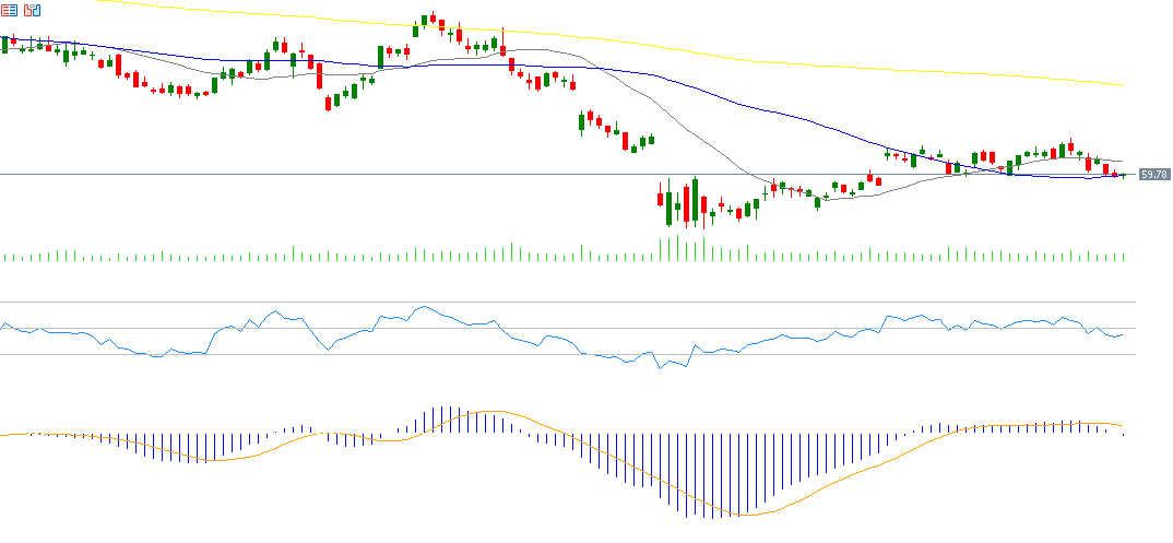 تراجع سهم Nike بنحو 21% منذ مطلع هذا العام حتى اليوم. وتترقب الأسواق صدور النتائج المالية لشركة Nike يوم الخميس 26 يونيو 2025، حيث تتوقع الأسواق تسجيل ربح قدره 0.11 دولار للسهم الواحد، بعد أن سجل 1.01 دولار في القراءة السابقة. أما بالنسبة للإيرادات، فتتوقع الأسواق أن تصل إلى 10.67 مليار دولار، بعد أن سجلت 12.60 مليار دولار في القراءة السابقة. ويبلغ مؤشر القوة النسبية (RSI) حاليًا 45 نقطة، ما يشير إلى زخم سلبي للسهم. كما يظهر مؤشر MACD تقاطعًا هبوطيًا بين خط MACD باللون الأزرق وخط الإشارة (SIGNAL LINE) باللون البرتقالي، مما يعزز الزخم السلبي لسهم Nike.
