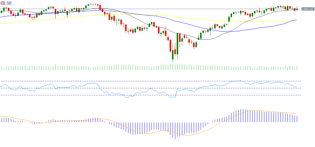 سجل مؤشر ناسداك 100 أداءً حياديًا الأسبوع الماضي، حيث أغلق يوم الجمعة عند مستوى 21,626 نقطة. وارتفع المؤشر بنحو 3% منذ مطلع العام حتى اليوم، ويُعزى هذا الارتفاع إلى استمرار مرونة سوق العمل الأميركي، والنتائج المالية الإيجابية للشركات الأميركية، وتحديدًا شركات التكنولوجيا الكبرى، وتوقعات أعضاء الفيدرالي بتخفيض أسعار الفائدة مرتين هذا العام. ويبلغ مؤشر القوة النسبية (RSI) حاليًا 57 نقطة، ما يشير إلى زخم إيجابي لمؤشر ناسداك 100.