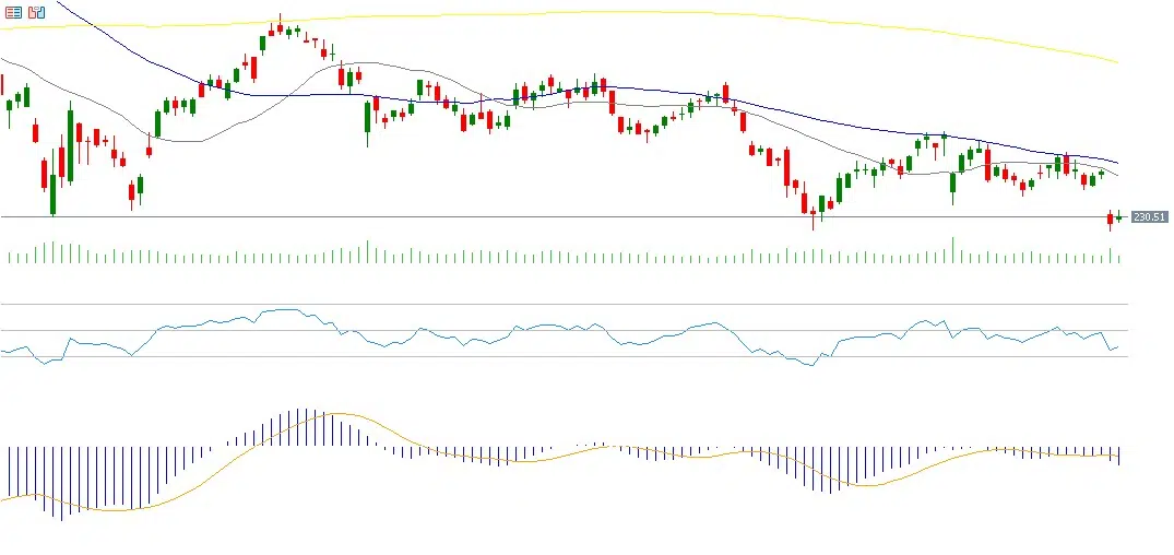 تراجع سهم Salesforce بنحو 31% منذ مطلع هذا العام حتى اليوم. وتترقب الأسواق يوم الأربعاء 3 ديسمبر 2025 صدور النتائج المالية للشركة، حيث تتوقع الأسواق أن تسجل ربحًا قدره 2.86 دولار للسهم الواحد، بعد أن سجلت 2.41 دولار في القراءة السابقة. أما الإيرادات، فتتوقع الأسواق أن تصل إلى 10.27 مليارات دولار، بعد أن سجلت 9.44 مليارات دولار سابقًا. ويسجل مؤشر القوة النسبية (RSI) حاليًا 42 نقطة، ما يشير إلى الزخم السلبي للسهم. كما يُظهر مؤشر MACD تقاطعًا هبوطيًا بين خط MACD (باللون الأزرق) وخط الإشارة (Signal Line) (باللون البرتقالي)، مما يعطي زخمًا سلبيًا للسهم.