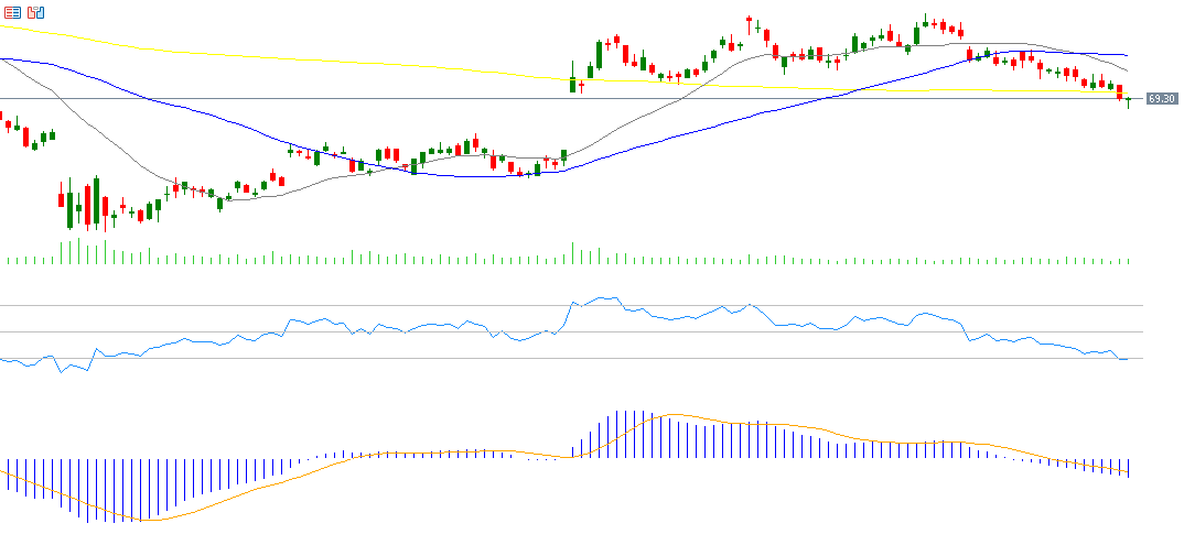 تراجع سهم Nike بنحو 8٪ منذ مطلع هذا العام حتى اليوم. وتترقب الأسواق يوم الثلاثاء 30 سبتمبر 2025 صدور النتائج المالية لشركة Nike، حيث تتوقع الأسواق أن تسجّل ربحًا قدره 0.27 دولار للسهم الواحد، بعد أن سجّلت 0.70 دولار في القراءة السابقة. أما بالنسبة للإيرادات، فتتوقع الأسواق أن تصل إلى 10.96 مليار دولار، بعد أن سجّلت 11.60 مليار دولار في القراءة السابقة. ويسجّل مؤشر القوة النسبية (RSI) حاليًا 30 نقطة، أي في منطقة التشبّع البيعي، مما يشير إلى الزخم السلبي لسهم Nike. أما مؤشر MACD، فيُظهر تقاطعًا هبوطيًا بين مؤشر MACD (الخط الأزرق) وخط الإشارة (الخط البرتقالي)، مما يعطي زخمًا سلبيًا لسهم Nike.