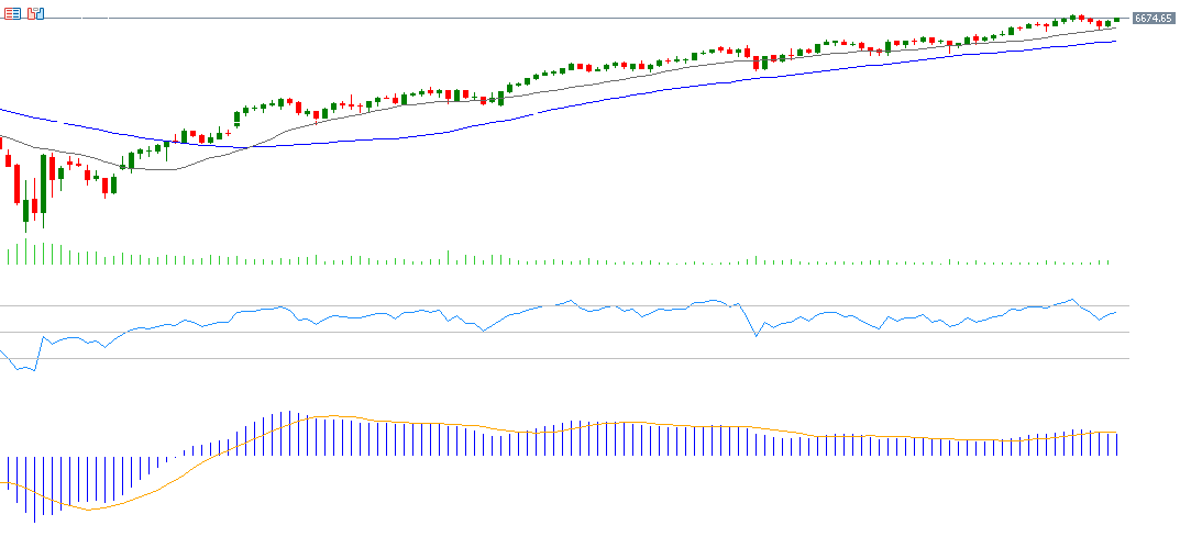 بعد سلسلة من ثلاثة أسابيع على التوالي من الارتفاعات، تراجع مؤشر S&P 500 بنسبة 0.31٪ خلال الأسبوع الماضي. وسجّل يوم الثلاثاء 23 سبتمبر مستوى قياسيًا جديدًا عند 6,700 نقطة، ليغلق عند 6,644 نقطة يوم الجمعة. وقد ارتفع المؤشر بنحو 13٪ منذ بداية العام وحتى تاريخه. تتوقع الأسواق استمرار الزخم الإيجابي في الأسهم الأميركية خلال المرحلة القادمة، رغم ارتفاع التقييمات، وذلك بسبب خفض أسعار الفائدة الأميركية بمقدار 25 نقطة أساس من قبل الفيدرالي في اجتماعه في 17 سبتمبر كما كانت تتوقع الأسواق. وقد جاءت توقعات “الدوت بلوت” مشيرة إلى إمكانية خفض إضافي بمقدار 50 نقطة أساس خلال العام الجاري، واستمرار الزخم الإيجابي لأسهم شركات التكنولوجيا الكبرى، حيث سجّل المؤشر المكوَّن من “السبع العظماء” (MAGS) مستوى قياسيًا جديدًا يوم الثلاثاء، وهو مرتفع بنحو 18٪ منذ بداية العام، بالإضافة إلى تسجيل مؤشر فيلادلفيا لأشباه الموصلات (SOX) مستويات قياسية يوم الثلاثاء، بارتفاع قدره نحو 27٪ منذ مطلع العام، ما يشير إلى استمرار الطلب على المنتجات المرتبطة بالذكاء الاصطناعي والتدفقات الاستثمارية الضخمة على البنية التحتية لهذا القطاع. ويسجّل مؤشر القوة النسبية (RSI) حاليًا 63 نقطة، مما يشير إلى الزخم الصعودي للمؤشر.