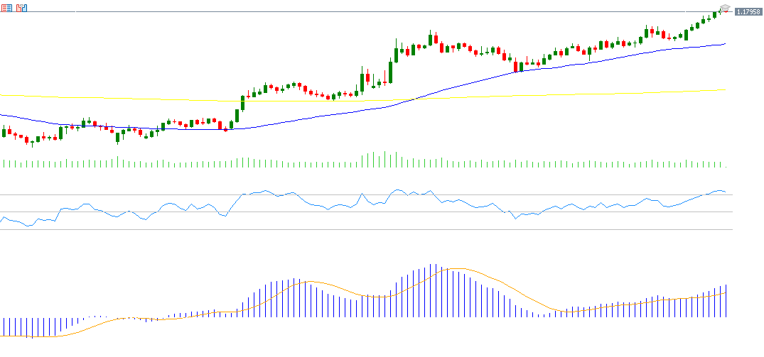 يسجل مؤشر القوة النسبية (RSI) حاليًا حوالي 74 نقطة، ما يشير إلى زخم إيجابي قوي لزوج اليورو مقابل الدولار الأميركي. كما يظهر مؤشر MACD تقاطعًا صعوديًا بين الخط الأزرق وخط الإشارة البرتقالي، مما يعزز التوقعات باستمرار الزخم الصعودي للزوج.