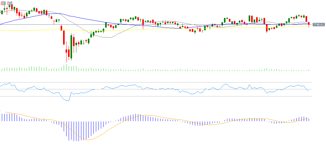 ويبدو أن هناك مستوى دعم استراتيجي يتمثل في المتوسط المتحرك لـ20 يومًا (باللون الرمادي) عند 7,800 نقطة، يليه مستوى الدعم الثاني وهو المتوسط المتحرك لـ50 يومًا (باللون الأزرق) عند 7,757 نقطة. وأي تقاطع هبوطي بينهما قد يشير إلى بداية الاتجاه النزولي لمؤشر CAC40.