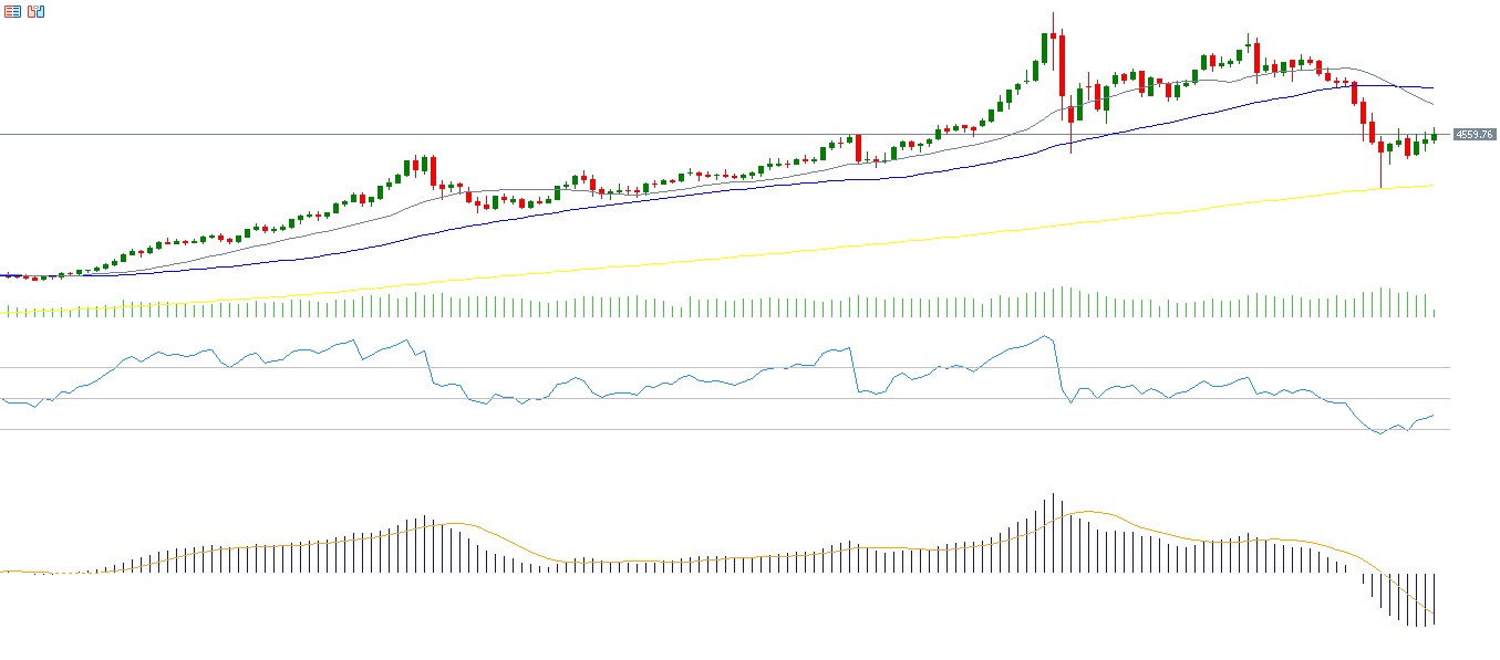 من الناحية الفنية للذهب، شهدنا تقاطعًا هبوطيًا بين المتوسط المتحرك لـ20 يومًا الذي يقف عند 4,815 دولار والمتوسط المتحرك لـ50 يومًا الذي يقف عند 4,955 دولار، ما قد يشير إلى اتجاه هبوطي للذهب على المدى القصير. كما يُعد المتوسط المتحرك لـ200 يوم عند مستوى 4,100 دولار تقريبًا دعمًا استراتيجيًا، حيث اقتربت منه الأسعار دون أن تتمكن من كسره، ما يدل على قوة هذا المستوى. كذلك يسجل مؤشر القوة النسبية مستوى 40 نقطة، ما يعكس زخمًا سلبيًا، إلى جانب ظهور تقاطع هبوطي بين خط الماكد وخط الإشارة، وهو ما يعزز احتمالات استمرار هذا الزخم السلبي.