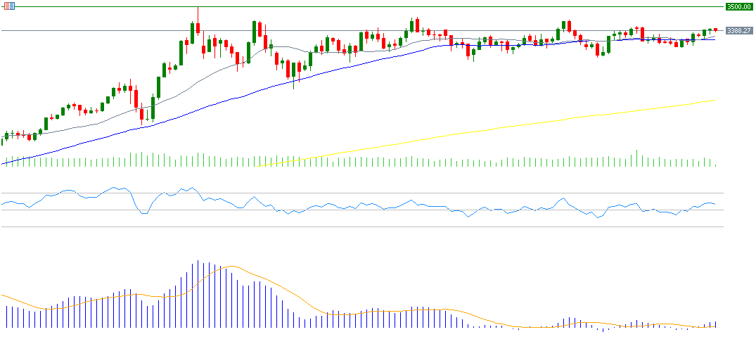 من الناحية الفنية، يبدو أن هناك مستوى دعم استراتيجي يتمثل في المتوسط المتحرك لـ20 يومًا (باللون الرمادي) عند 3,363 دولار، يليه مستوى الدعم الثاني وهو المتوسط المتحرك لـ50 يومًا (باللون الأزرق) عند 3,348 دولار.