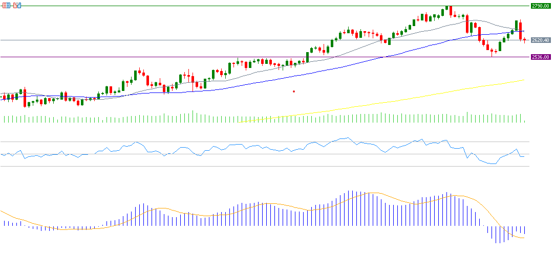 - تقارب بين متوسط الحركة لـ20 يومًا باللون الرمادي الذي يقف عند 2,662 دولار ومتوسط الحركة لـ50 يومًا باللون الأزرق الذي يقف عند 2,665 دولار، وأي تقاطع هبوطي بينهما قد يعطي إشارة سلبية للذهب.