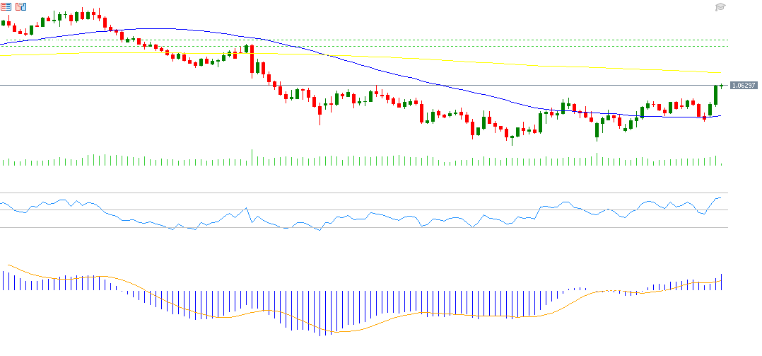 ارتفع سعر زوج اليورو مقابل الدولار الأميركي ليسجل 1.0628 يوم أمس، وهو أعلى مستوى له منذ 6 ديسمبر 2024، وذلك بعد تداوله في نطاق عرضي بين مستوى الدعم 1.0200 ومستوى المقاومة 1.0500 خلال الأشهر الثلاثة الأخيرة.