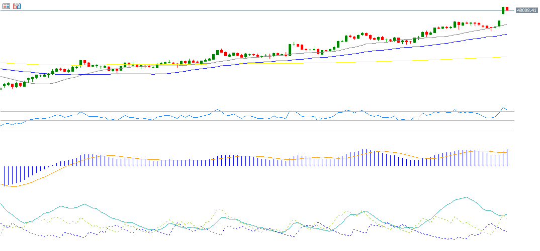 - يسجل مؤشر الحركة الإيجابية (DMI+) حوالي 51 نقطة، مقابل مؤشر الحركة السلبية (DMI-) الذي يسجل حوالي 13 نقطة. نلاحظ أن الفجوة بين هذين المؤشرين كبيرة، مما يعني وجود ضغوط شرائية قوية على مؤشر نيكاي 225. والأهم من ذلك أن مؤشر قوة الاتجاه (ADX) يسجل حوالي 37 نقطة، مما يدل على أن زخم هذا الاتجاه الصاعد قوي.