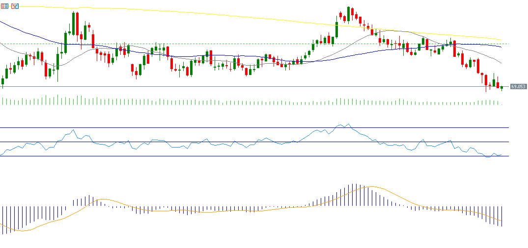 أما بالنسبة لمؤشر القوة النسبية (RSI)، فهو يسجل حاليًا 33 نقطة، ما يشير إلى الزخم الهبوطي لأسعار النفط. بالإضافة إلى ذلك، يظهر مؤشر MACD أن الخط الأزرق أدنى من خط الإشارة (Signal Line) باللون البرتقالي، مما يعزز استمرار الزخم السلبي لأسعار النفط الخام.