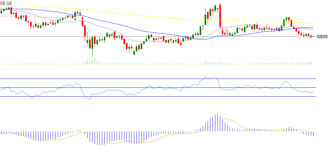 أما بالنسبة لمؤشر القوة النسبية (RSI)، فيسجل حاليًا 39 نقطة، مما يعكس زخمًا سلبيًا للأسعار. كما يظهر تقاطع هبوطي بين خط MACD (باللون الأزرق) وخط الإشارة (Signal Line) باللون البرتقالي، مما يعزز استمرار الزخم السلبي لأسعار النفط الخام.