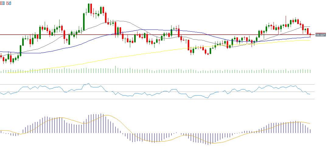 تراجعت أسعار الفضة إلى مستوى 30.81 دولارًا يوم الجمعة 28 فبراير 2025، وهو أدنى مستوى لها منذ 3 فبراير 2025، لتتداول حاليًا بالقرب من 31 دولارًا. يسجل مؤشر القوة النسبية (RSI) حاليًا 43 نقطة، مما يشير إلى الزخم الهبوطي للفضة. أما مؤشر MACD، فيظهر تقاطعًا هبوطيًا بين مؤشر MACD باللون الأزرق وخط الإشارة (Signal Line) باللون البرتقالي، مما يعطي زخمًا سلبيًا للفضة.