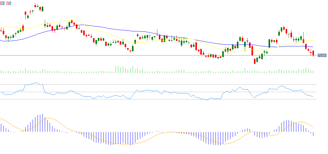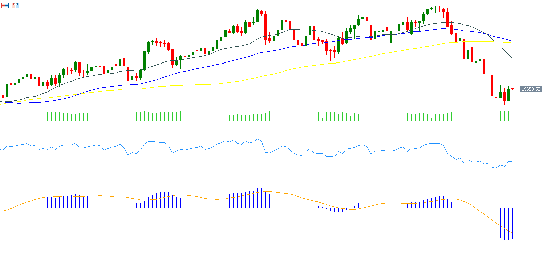 سجل مؤشر ناسداك 100 مستوى 19,153 نقطة يوم الخميس 13 مارس 2025، وهو أدنى مستوى منذ 12 سبتمبر 2024، ثم أغلق هذا المؤشر عند مستوى 19,705 نقطة يوم الجمعة 14 مارس 2025. وقد تراجع هذا المؤشر بنسبة 14% منذ القمة التي سجلها في 19 فبراير 2025 والتي بلغت 22,223 نقطة إلى قاع الأمس. كما تراجع بنحو 6% منذ بداية هذا العام حتى إغلاق الجمعة. أما أبرز العوامل التي تضغط على الأسهم الأميركية فهي: مخاوف من دخول الاقتصاد الأميركي في مرحلة ركود، والحرب التجارية بين إدارة ترامب وبعض الدول، وضعف المؤشرات الاقتصادية الأميركية في الآونة الأخيرة، وموجة نزوح للأموال من الأسهم الأميركية إلى الأسهم الصينية تحديدًا في القطاع التكنولوجي. أما مؤشر القوة النسبية RSI فيسجل حاليًا 38 نقطة، ما يشير إلى الزخم الهبوطي للناسداك 100. أما مؤشر MACD، فيظهر تقاطع هبوطي بين مؤشر MACD باللون الأزرق مع الـ SIGNAL LINE باللون البرتقالي، مما يعطي زخمًا سلبيًا للناسداك 100.