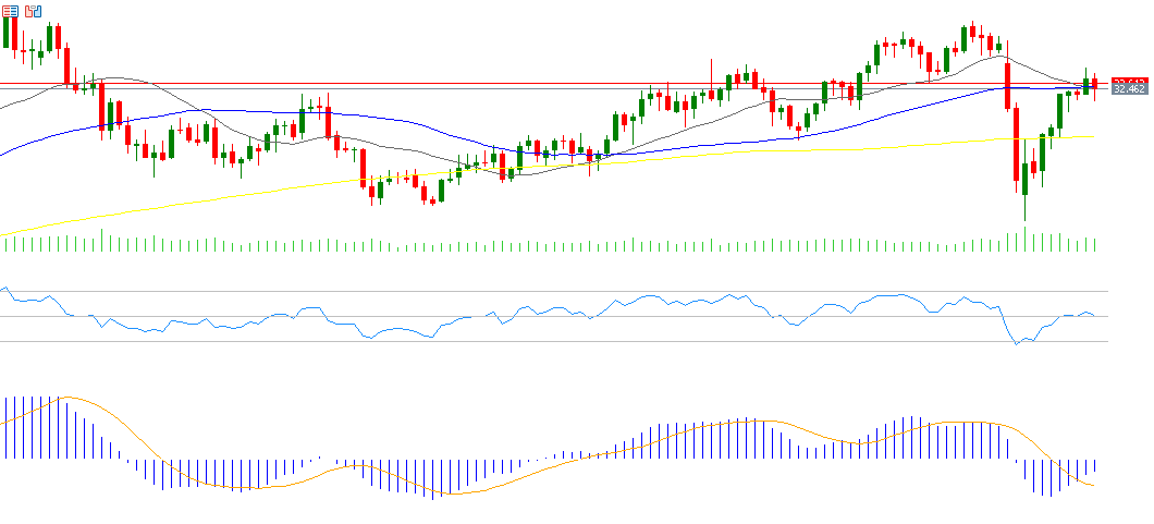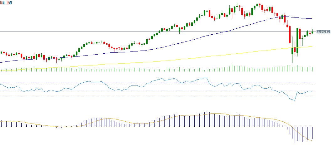 ارتفع مؤشر داكس الألماني بنحو 7% منذ بداية العام وحتى الآن. وعلى الرغم من الإيجابية المحيطة بالمؤشر، إلا أن حالة من الضبابية لا تزال تسيطر عليه، خاصة في ظل الحرب التجارية بين إدارة ترامب ودول العالم، وبشكل خاص مع الاتحاد الأوروبي. ويسجل مؤشر القوة النسبية (RSI) حاليًا نحو 47 نقطة، ما يشير إلى ميل طفيف نحو الزخم الهبوطي في الوقت الحالي.