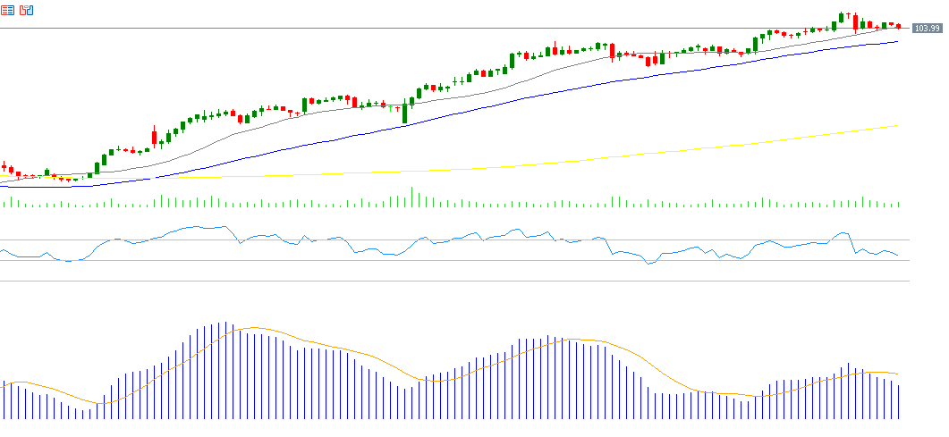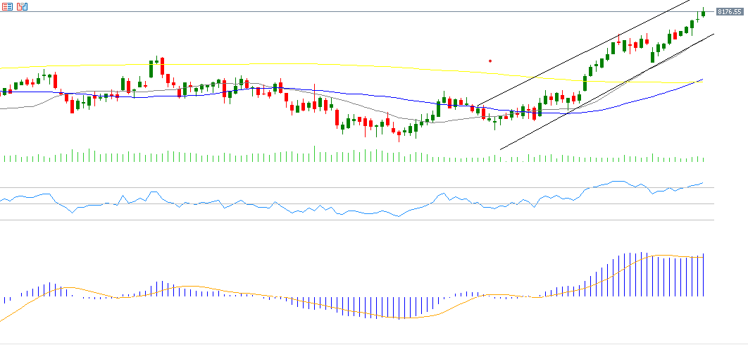ارتفع مؤشر CAC40 بنحو 11% منذ مطلع العام حتى اليوم. ويبدو أن الزخم الإيجابي لهذا المؤشر مستمر في المرحلة القادمة، وذلك نتيجة لعدة عوامل، أبرزها استمرار خفض أسعار الفائدة من قبل البنك المركزي الأوروبي، ما يدعم الأسهم الأوروبية. ويسجل مؤشر القوة النسبية RSI حاليًا 77 نقطة، أي في منطقة التشبع الشرائي، ما يشير إلى الزخم الإيجابي لمؤشر CAC40 أما مؤشر MACD، فيظهر تقاطعًا صعوديًا بين خط MACD باللون الأزرق وخط الإشارة باللون البرتقالي، مما يعطي زخمًا إيجابيًا لمؤشر CAC40