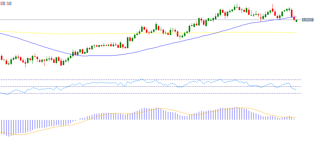 تراجع سعر الدولار الأميركي مقابل الفرنك السويسري، مسجلًا 0.8971 يوم الجمعة، ويحوم حاليًا قرب مستويات 0.9000، وذلك بسبب ضعف مبيعات التجزئة في الولايات المتحدة، ما أثر سلبًا على الدولار مقابل جميع العملات الرئيسية. ورغم ذلك، تظهر البيانات الاقتصادية السويسرية الأخيرة أن الاقتصاد السويسري يعاني من ضعف فعلي، حيث تراجع مؤشر مديري المشتريات إلى أدنى مستوى له منذ يوليو من العام الماضي، بالإضافة إلى ارتفاع معدل البطالة مسجلًا 3.0%. ويسجل مؤشر القوة النسبية RSI حاليًا 41 نقطة، ما يشير إلى الزخم الهبوطي لزوج الدولار الأميركي / الفرنك السويسري. أما مؤشر MACD، فيظهر تقاطعًا هبوطيًا بين خط MACD باللون الأزرق وخط الإشارة (Signal Line) باللون البرتقالي، مما يعطي زخمًا هبوطيًا للدولار مقابل الفرنك السويسري.